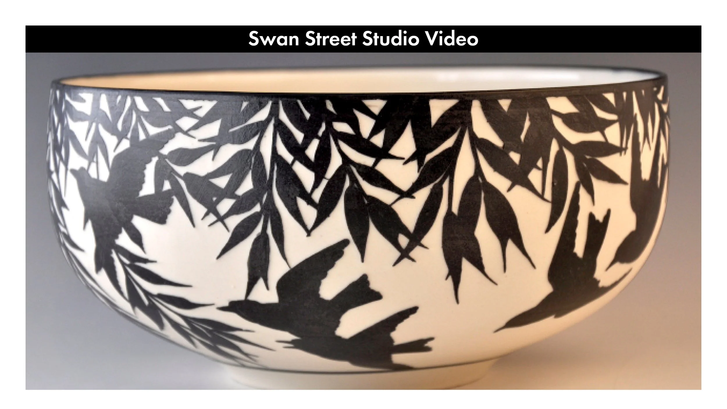 Katherine Hackl has expanded her pottery work to include a new etched porcelain process. This is a new technique for her that blends some of the characteristics of her traditional sgraffito carved work and her hand painted brush work, while creating a look that is altogether new. These pieces have a lovely light texture to them and a soft matte surface. They have images of meadows, trees, birds and berries, among many other themes. She has included a strong new blue and white series alongside the black and white, and the white on white work. She continues to do her traditional stoneware sgraffito work with many new patterns and images and has several new tile projects in the works.